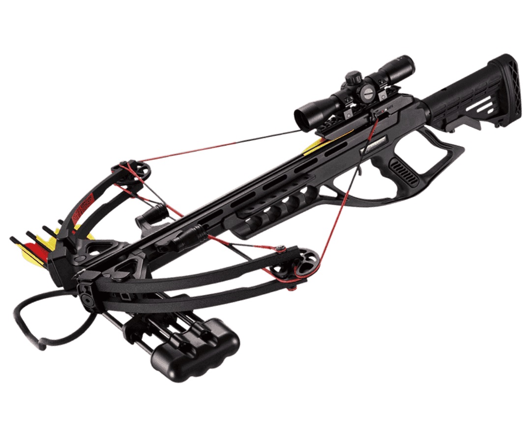 В комплекте – оптический прицел 4х32, установленный на низких кольцах. Имеется автоматический предохранитель и направляющая Вивера. Вес арбалета 3,6 кг, длина 92 см при ширине 55 см, выполнен он в черном цвете.