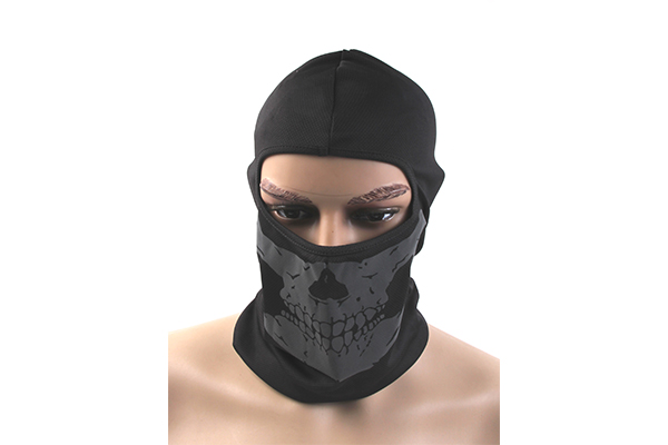 Имеющая универсальный размер балаклава влаговыводящая благодаря одному большому отверстию для глаз не только прикроет лицо страйкболиста от попадания шариков, но и убережет его от холода в прохладные месяцы, а летом от прямых лучей солнца. Изделие пошито с использованием нецарапающей строчки. Раскраска светоотражающая типа black/grey skull.