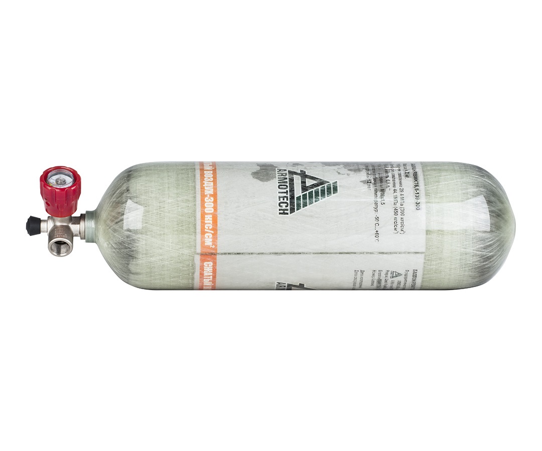 Баллон металлокомпозитный облегченный Armotech вместимостью 6,8 л на рабочее давление воздуха 29,4 МПа предназначен для хранения, транспортирования и использования сжатого воздуха. Баллон сертифицирован, имеет разрешение на применение. Срок службы — 15 лет или 7500 циклов заправок.