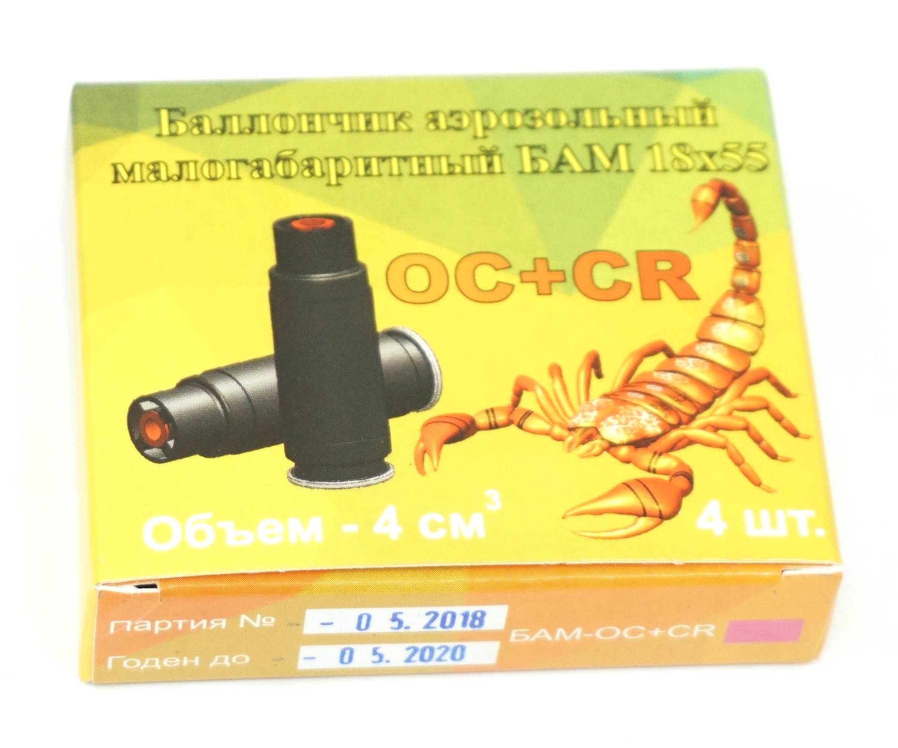 БАМ-ОС+CR 18×55 – это эффективное средство для самообороны граждан в комплексе с аэрозольными устройствами (пистолетами) «Премьер» и «Премьер-4». В состав данных БАМ входит действующее вещество дибензоксазепин (CR) 1% – сильнейший из ирритантов, и экстракт жгучего красного перца – олеорезин капсикум (ОС) 6%. Запрещается разбирать и переснаряжать!