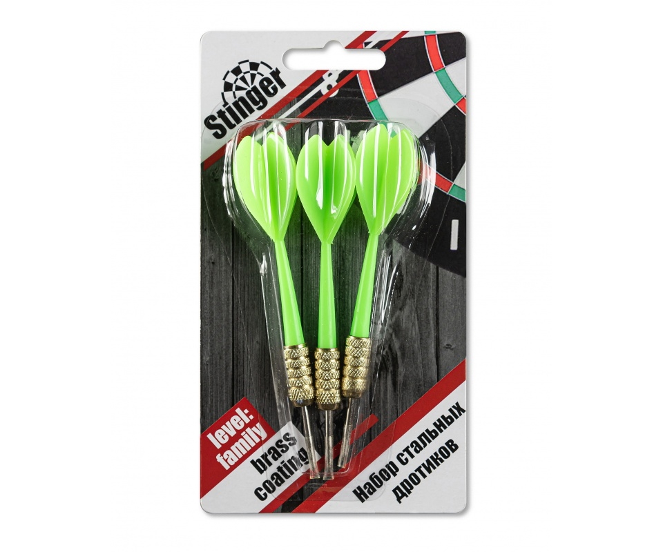 Дротики для дартса Stinger, 3 штуки , уровень — начальный, баррель — сталь с покрытием латунь, игла — сталь, хвостовик — нейлон, оперение — нейлон. Вес — 8 грамм.