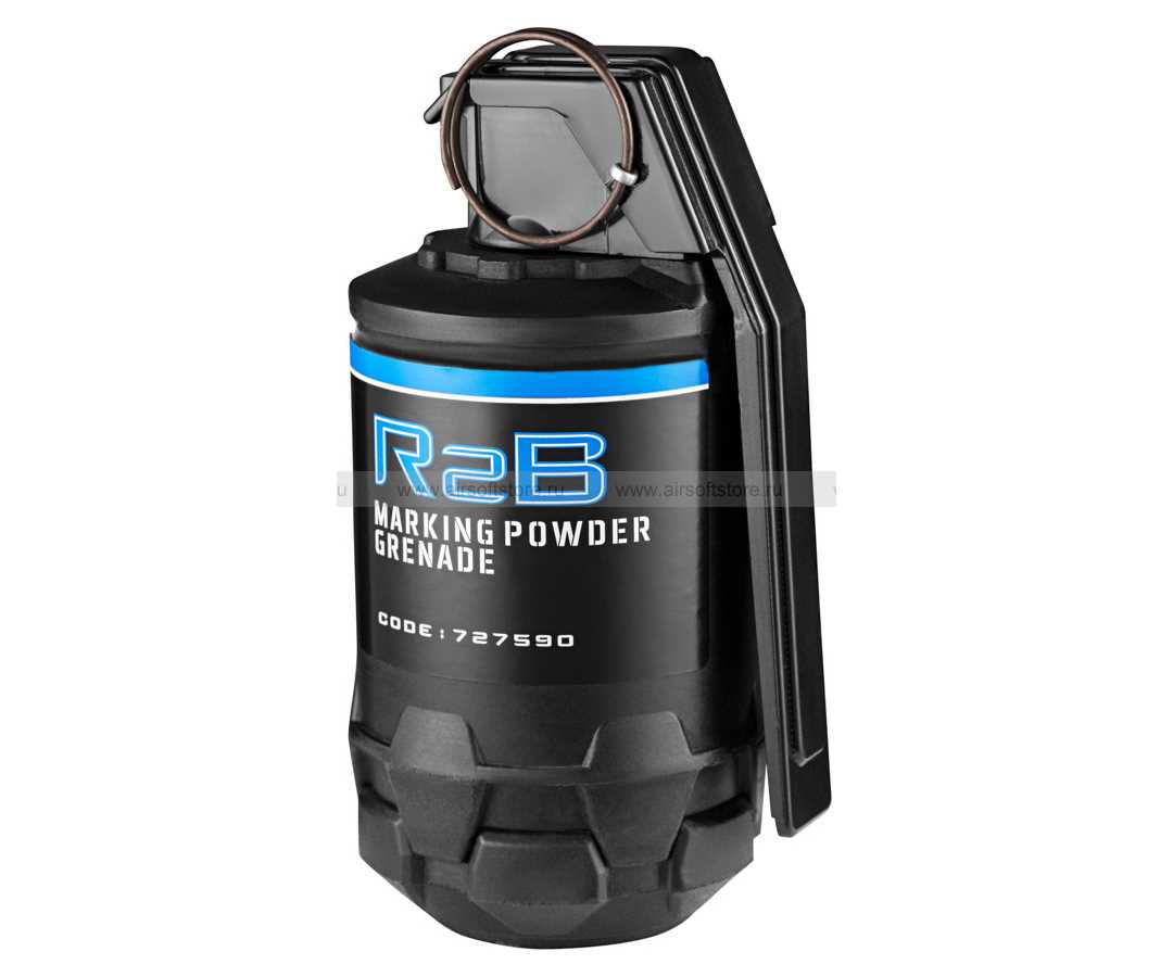 R2BM – маркирующая ручная имитационная граната, снаряжена порошковым маркирующим составом на основе негорючих и нетоксичных мелкодисперсных компонентов. Порошковый состав изготовлен на основе мелкодисперсных, нетоксичных материалов. Граната прекрасно подходит для поражения целей в зданиях и на близких расстояниях, а также когда применение поражающих элементов может быть опасно. Радиус поражения: 2-5 метров.