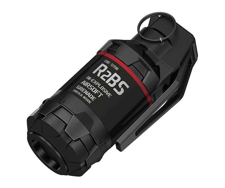 R2BS – страйкбольная ручная имитационная граната, снаряжена условно-поражающими элементами в виде пластиковых шариков диаметром 6 мм массой 0,2 г, в количестве 210 штук. Корпус изготовлен из травмобезопасного пенополиуретана. Содержит пиротехнический элемент с замедлительным узлом.