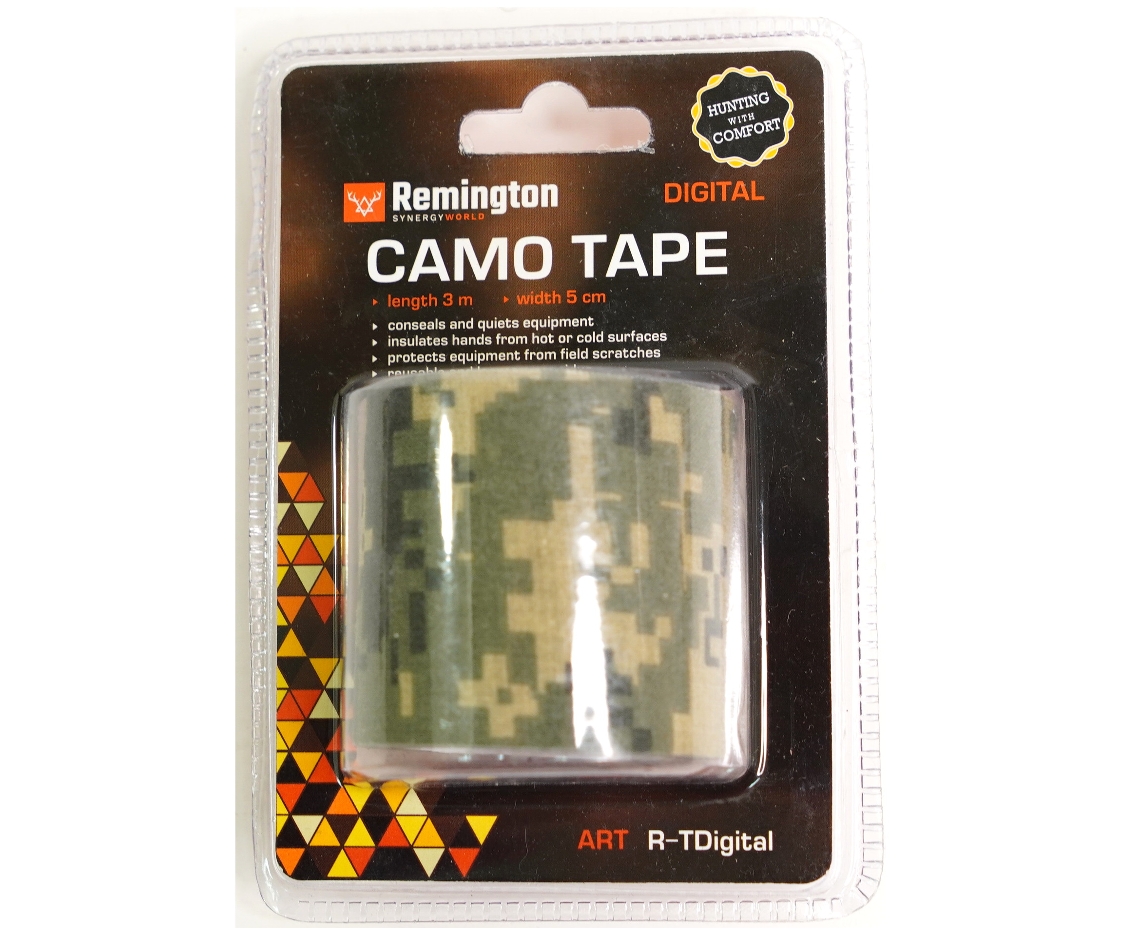 Многоразовая камуфляжная лента Remington Digital применяется для защиты и маскировки ружей, оптических прицелов, биноклей, фонарей, ножей, фляг и другого снаряжения. Использование ленты позволяет избежать солнечных бликов от оружия, маскирует его, а также защищает от влаги, пыли, механических повреждений, царапин. Уменьшает шум при использовании и вероятность соскальзывания руки. Защищает руки от горячих и холодных поверхностей.