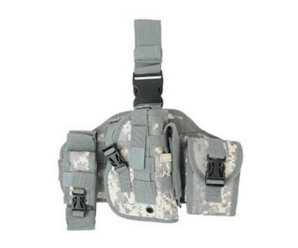 Универсальная набедренная кобура на платформе, изготовленная из кордуры. Платформа дополнительно оснащена одни гранатным подсумком и креплением для ножа. А на самой кобуре размещен дополнительный подсумок под пистолетный магазин.