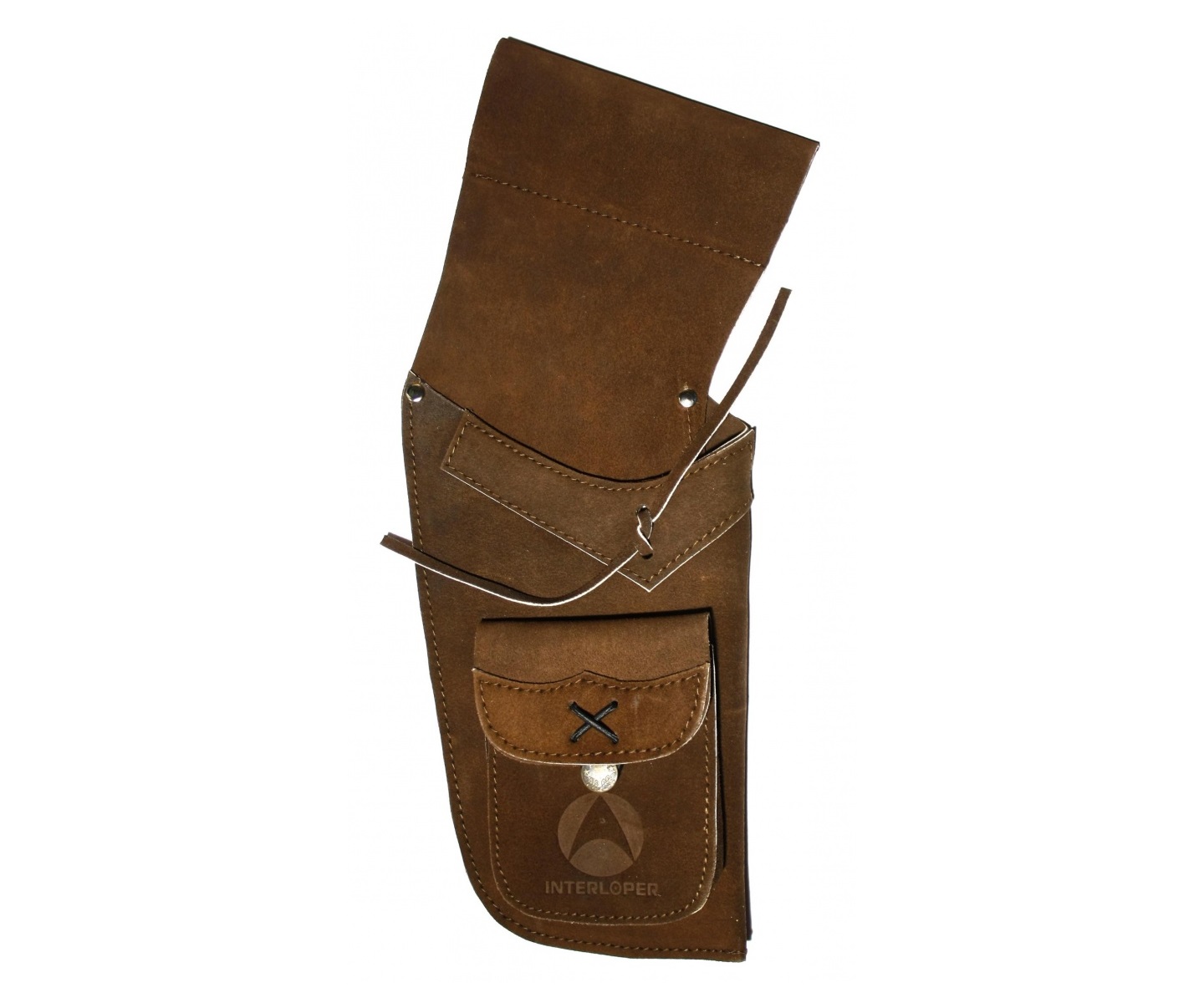 Подходит для ношения арбалетных стрел. Крепится на пояс на ремень. Есть карман для инструментов и мелких аксессуаров. Материал изготовления — натуральная замша.