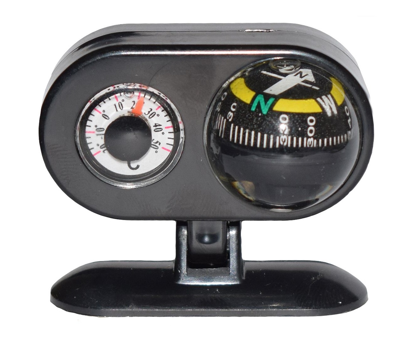 Компас для автомобиля, произведенный в Китае. Модель оснащена липкой поверхностью, которая используется для крепления компаса. Устройство имеет шарнир, благодаря которому можно отрегулировать угол наклона модели. Кроме того, компас включает в себя термометр.