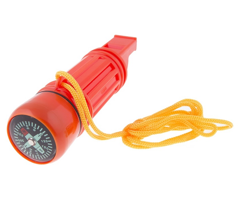 Многофункциональный спасательный компас. Внутри компаса располагается водонепроницаемый контейнер для предметов первой необходимости. Снабжен зеркалом для подачи сигналов. Аварийный свисток, огниво, шнур для ношения на шее.