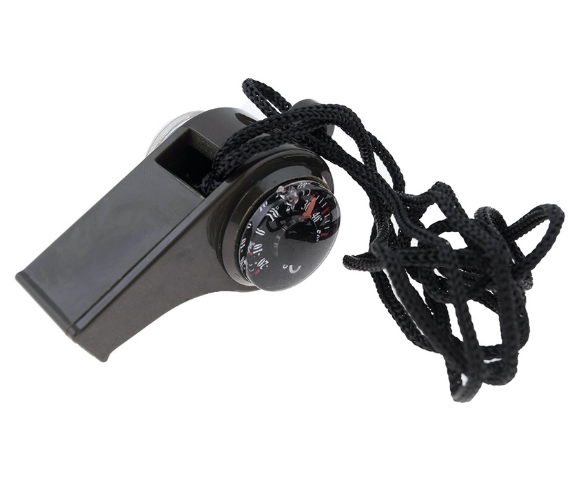 Компактный компас-свисток защитного цвета со шнурком для ношения. Дополнительно снабжен термометром.