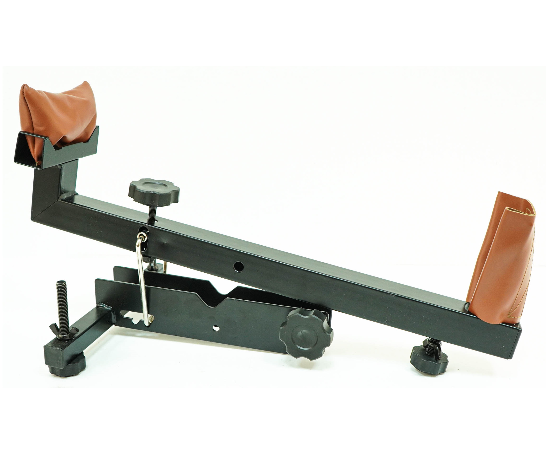 Конструкция выполнена из стали, качественная порошковая окраска и два прочных кожаных упора. Упоры изготовлены из кожи волов, передний упор наполнен силикогелем, а задний упор способствует гашению отдачи. Оба упора – съемные, не скользят и не повреждают оружие. На передней опоре установлен жидкостной нивелир. Ложемент имеет плавную регулировку по вертикали, которая осуществляется сначала при помощи переставного упора(3 положения), а затем винтом. Ножки имеют резиновые наконечники для стрельбы с твердых поверхностей и способствуют снижению отдачи. Конструкция ложемента – сборная, собирается без дополнительного инструмента.