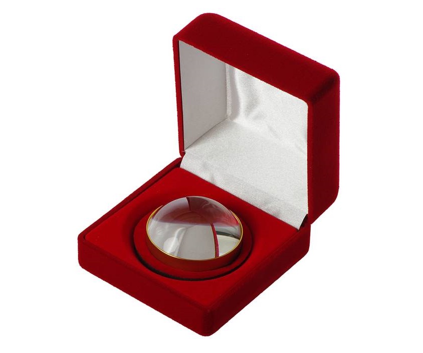 Лупа-пресс для бумаги, при размерах всего 30 мм в высоту и 50 мм в диаметре, имеет трехкратное увеличение. Сама линза заключена в металлическую оправу, обеспечивающую зазор между поверхностью лупы и листом, что обеспечивает гладкое и безопасное скольжение по любой поверхности. Лупа упакована в красивую подарочную коробочку.