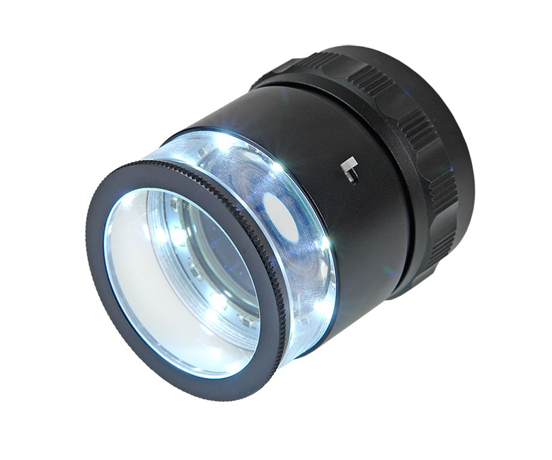 Измерения могут быть осуществлены как в дневном, так и искусственном (LED подсветка) свете с увеличением в 10 крат и с точностью 0,1 мм. Корпус лупы изготовлен из силумина с гальваническим покрытием. Подсветка осуществляется с помощью 8 микросветодиодов, расположенных у основания металлической части корпуса.