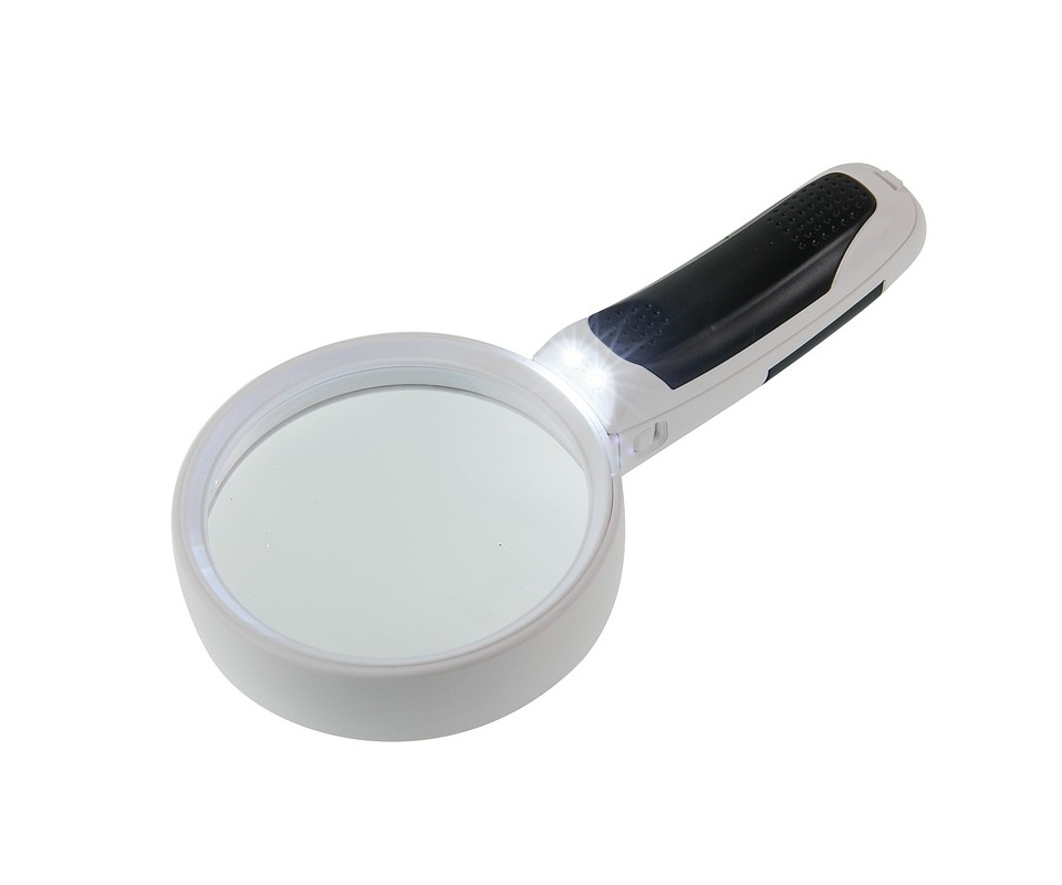 Оправа и ручка лупы изготовлены из пластика. Линза изготовлена из оптического стекла. Ручка съёмная со вставками из прорезиненного материала, длина ручки 101 мм. На передней стороне ручки расположен тумблер включения светодиодной подсветки, на обратной стороне – два светодиода. Питание подсветки осуществляется от 3 батареек ААА.