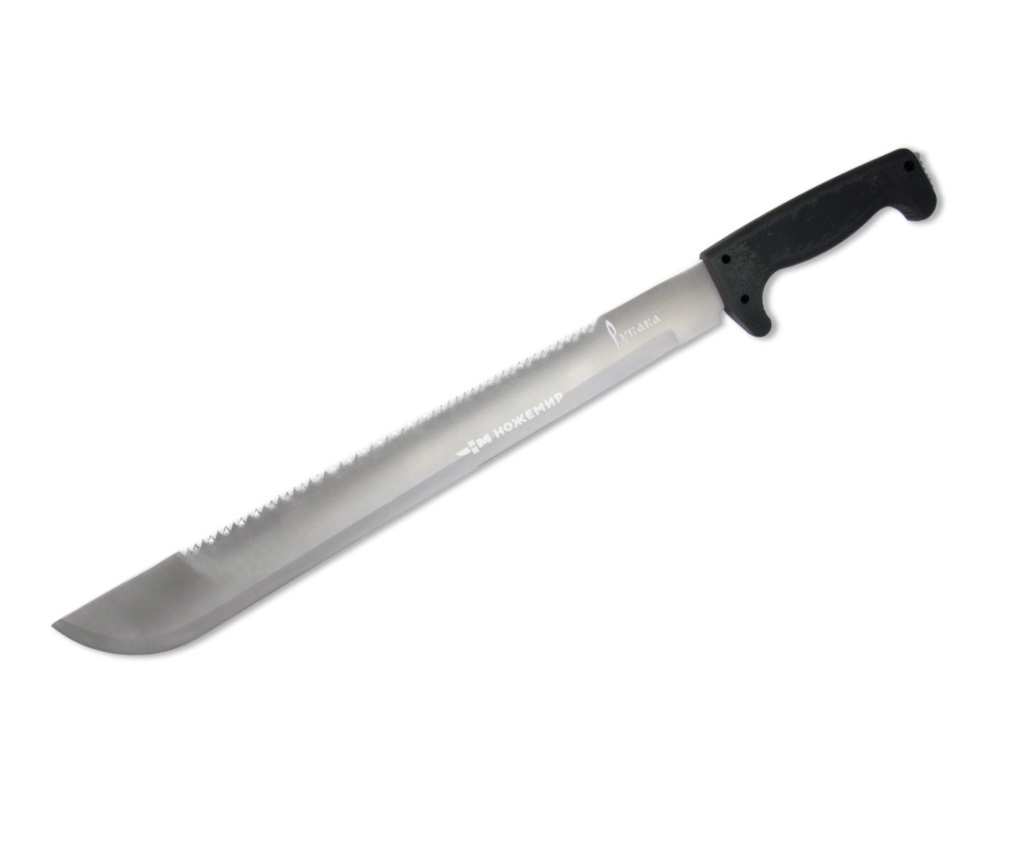 Материал клинка – сталь марки 40Х13 твердостью 45- 50 HRC. Удобные ножны изготовлены из современного материала кордура на основе нейлона, имеющего высокую прочность и износоустойчивость, а также обладающего водоотталкивающими характеристиками. На ножнах присутствует небольшой кармашек. Длина клинка – 45,8 см, общая длина изделия – 61 см.