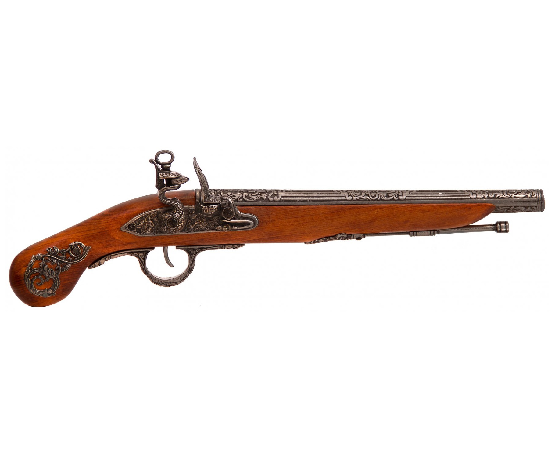 Реплика итальянского кремниевого пистоля 18 века (Flintlock pistol) с накладкой на рукояти. Выполнен из металла и дерева с имитацией механизма зарядки и выстрела.