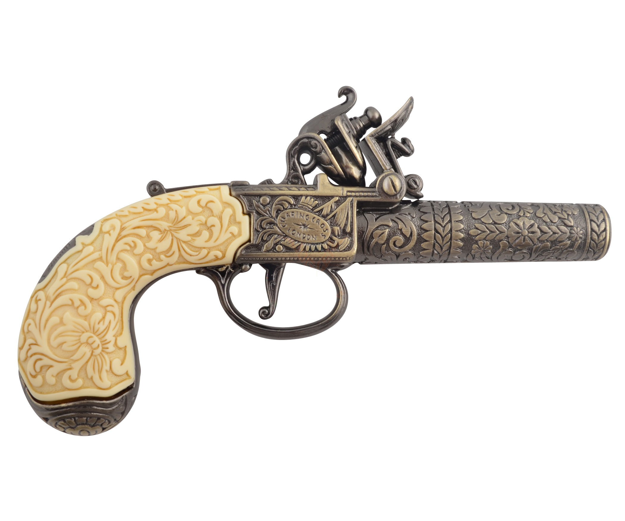 Макет пистолет кремневый карманный, под кость (Лондон, 1795 г.) DE-1098-L – это миниатюрное изделие мастеров компании Деникс, созданное на основе оригинального исторического оружия. За счет скрупулезности изготовления каждого элемента изделие в точности копирует боевой прототип и имеет эффектный внешний вид. Чтобы владелец мог полностью насладиться удовольствием от обладания таким изделием, есть возможность произвести взведение и нажать на курок.