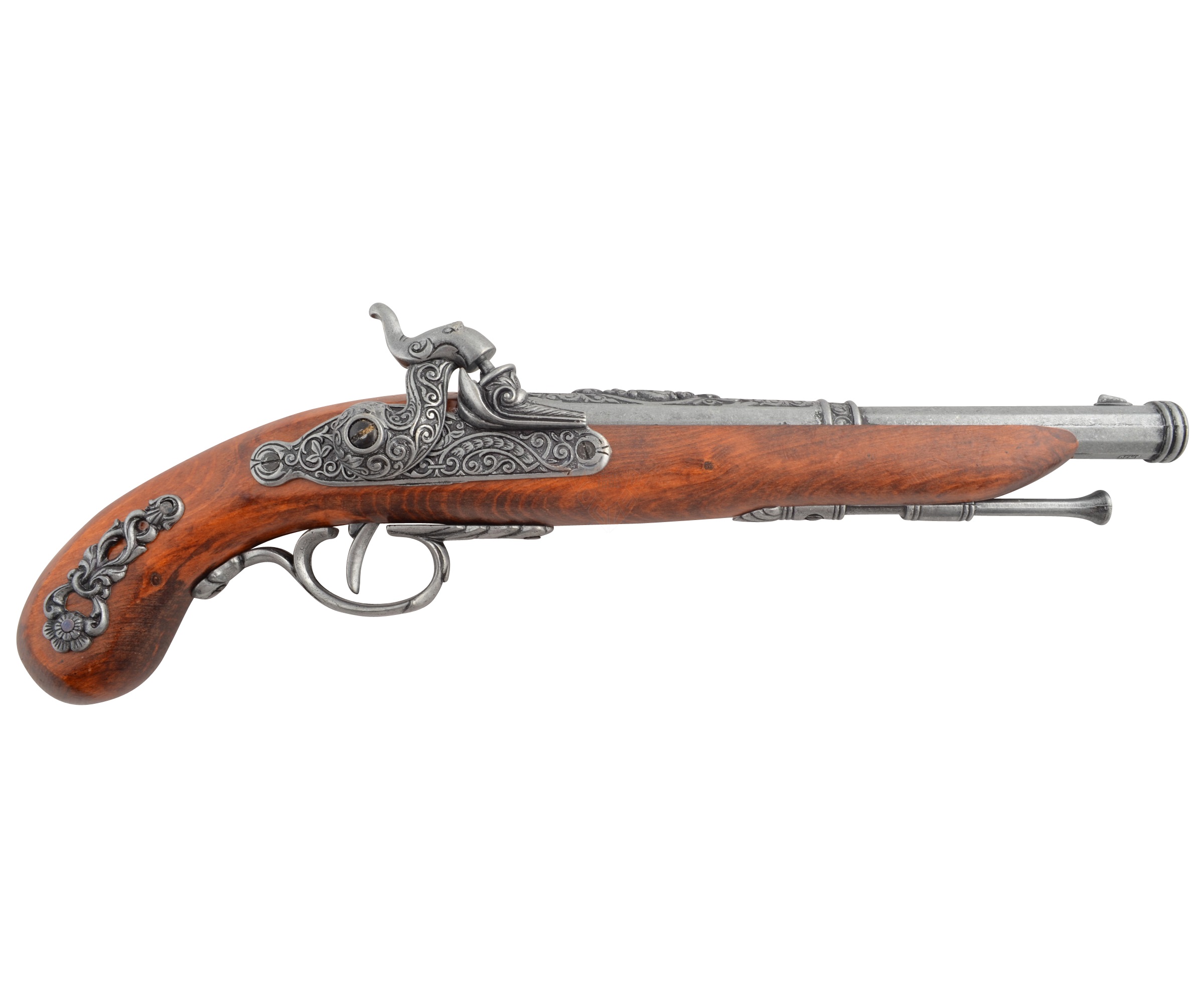Макет пистолет кремниевый (Франция, 1872 г.) от мастеров испанской компании сувенирного оружия Denix является великолепным образцом ручной работы. Использованием цинкового сплава замак придает реплике необходимую прочность, сталь применена в данном случае в качестве материала для украшения пистолета. Ложе и рукоятка оружия выполнены из дерева. Верхняя часть ствола, а также основание кремниевого замка и рукоять украшены стальными накладками с эффектным орнаментом. Имеется шомпол, закрепленный, как и полагается, под стволом. Кремниевый замок и УСМ здесь функционирующие. Длина макета составляет 37 см, масса – 0,515 гр. Копия выглядит очень достойно и качественно, внешне практически не отличается от оригинала.