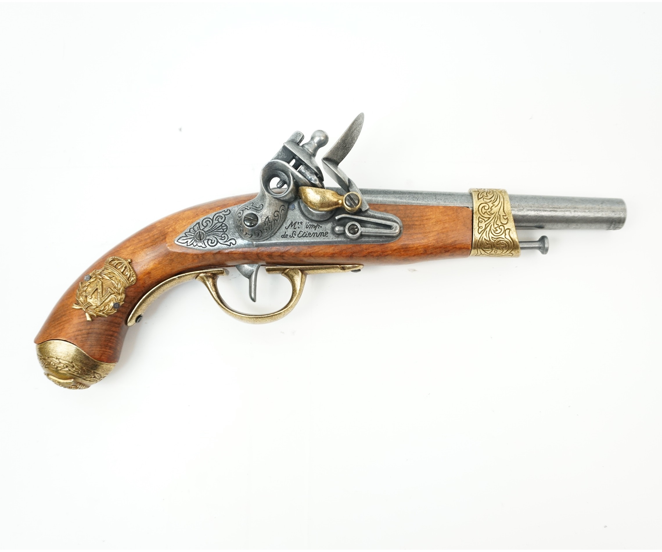 Макет пистолет Наполеона – это точная копия роскошного ударно-кремниевого оружия, возможно, принадлежавшего самому императору Наполеону. Знаменитый корсиканец, как и все его земляки, просто обожал оружие, и имел в коллекции немало уникальных образцов как холодного, так и огнестрельного оружия, часть из которого была добытая им на поле брани еще до того, как корсиканец стал Императором Франции.