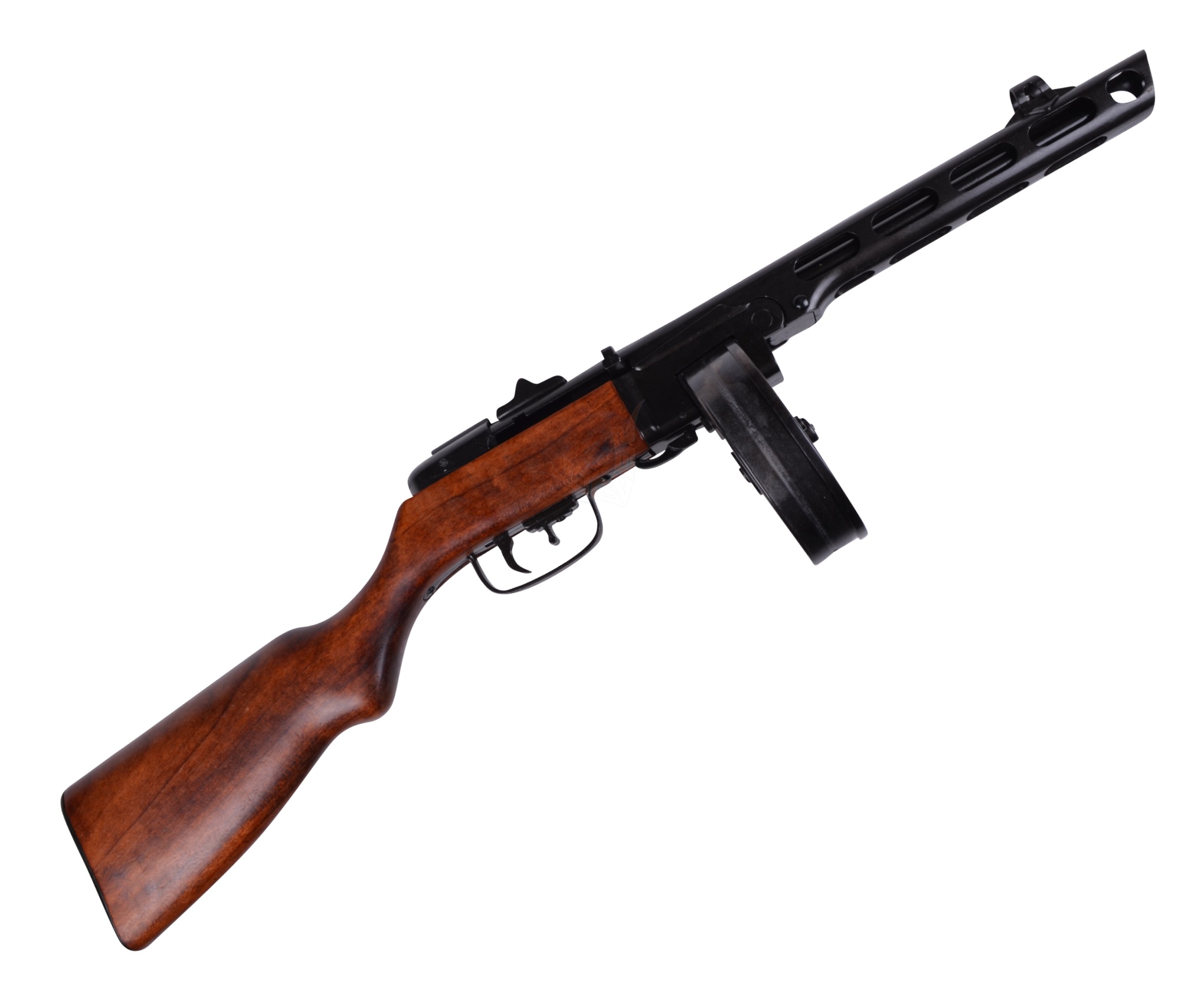 Макет пистолет-пулемета Шпагина ППШ-41 DE-1301 от испанского производителя Denix — современная полноразмерная копия. Материал: металл, дерево. Длина — 860 миллиметров.