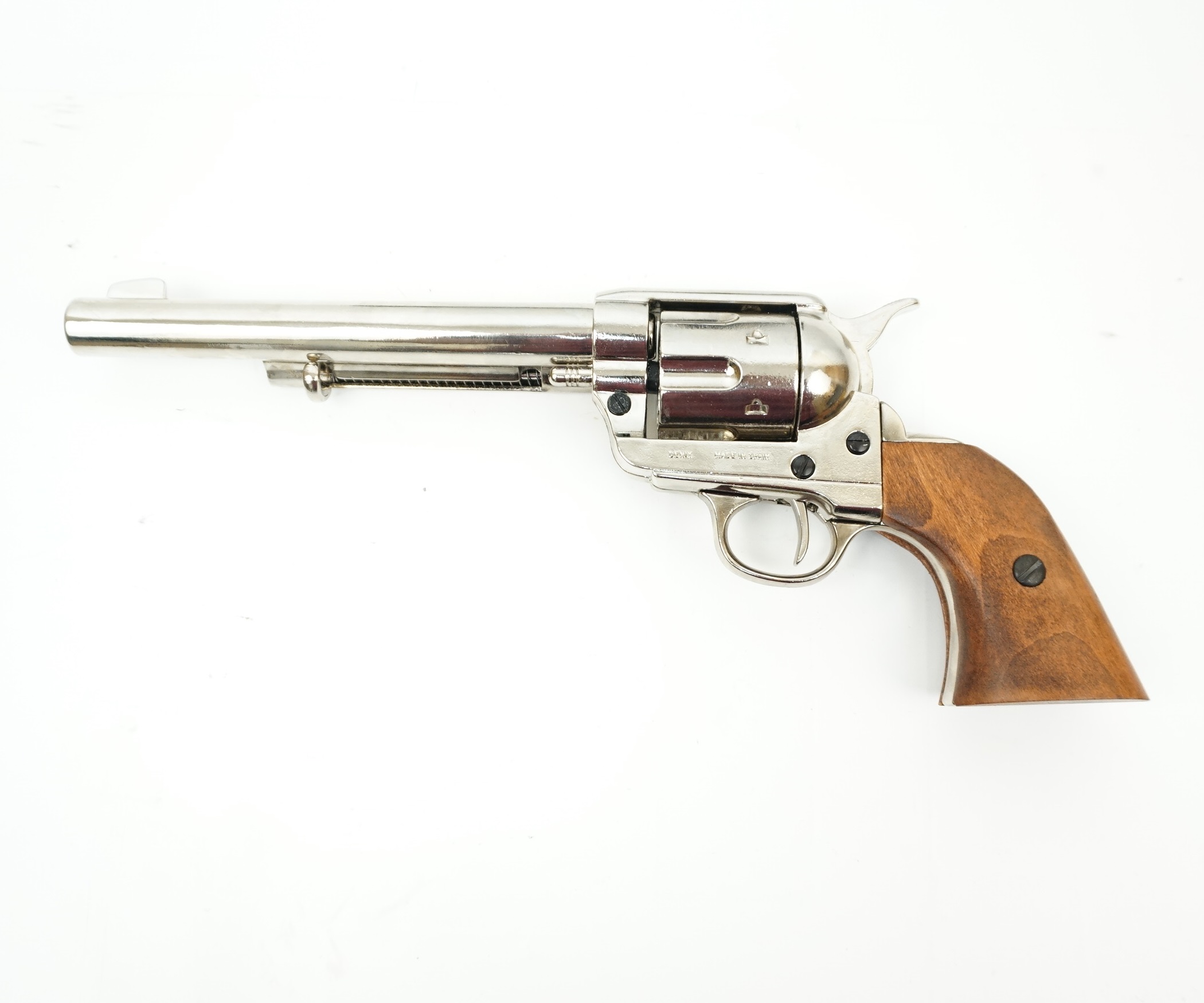 Макет револьвер Кольт кавалерийский, .45 калибра, 6 патронов (США, 1873 г.) DE-1-1191-NQ – это недорогое художественное изделие от мастеров бренда «Denix», выполненное как копия исторического оружия Америки второй половины 19 столетия. Макет кавалерийский Кольт отличается достойным качеством изготовления, и создан на основе настоящего боевого оружия. Изделие обладает рабочим барабаном, подвижными крючком спуска и курком. Барабан макета можно зарядить фальш-патронами, используя экстрактор.