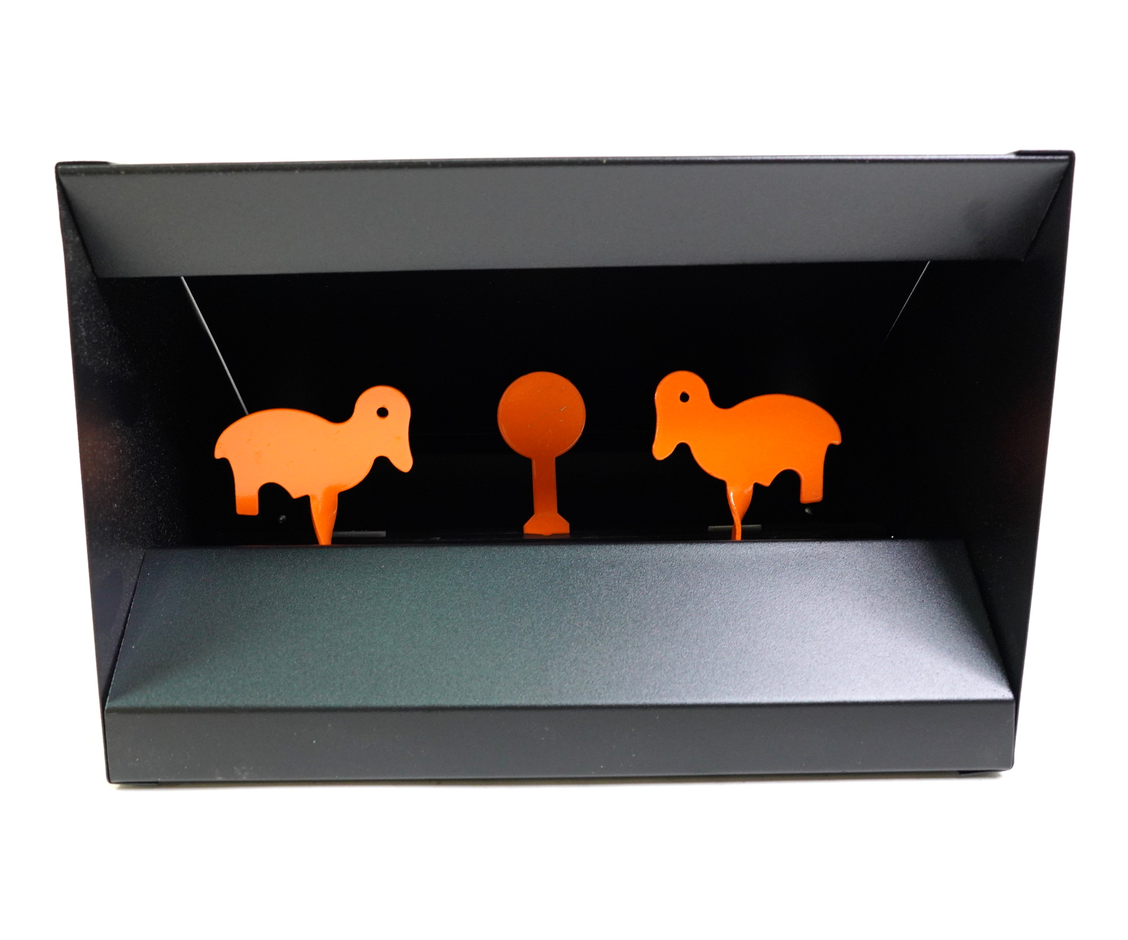 Это настоящий маленький тир. Его можно использовать на соревнованиях по стрельбе и при обычной тренировке. Фигурки при точном попадании ложатся горизонтально, чтобы снова взвести все мишени необходимо попасть в центральную круглую мишень. Утки имеют размер около 10 см, центральная мишень — около 4 см и очень хорошо подойдут для обучения стрельбе.