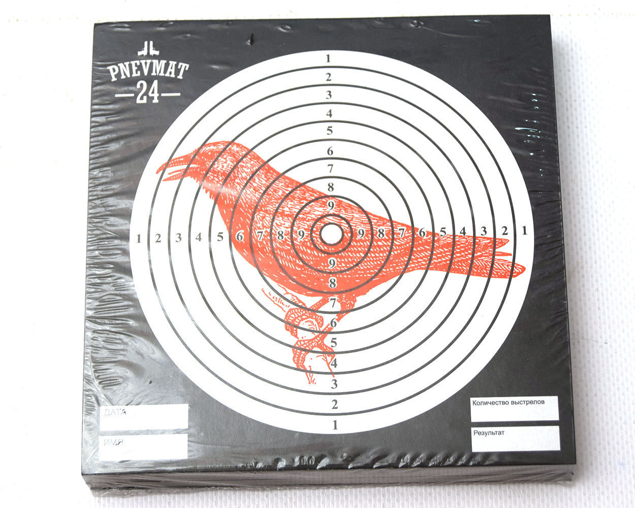 Радиус мишени 6 см, радиус кружка «десятки» 6 мм, расстояние между окружностями по 6 мм. Отличается от обычной спортивной мишени тем, что вместо черного круга в центре нарисована фигура вороны красного цвета, в которую и нужно осуществляеть прицеливание. Количество мишеней в упаковке: 50 штук.