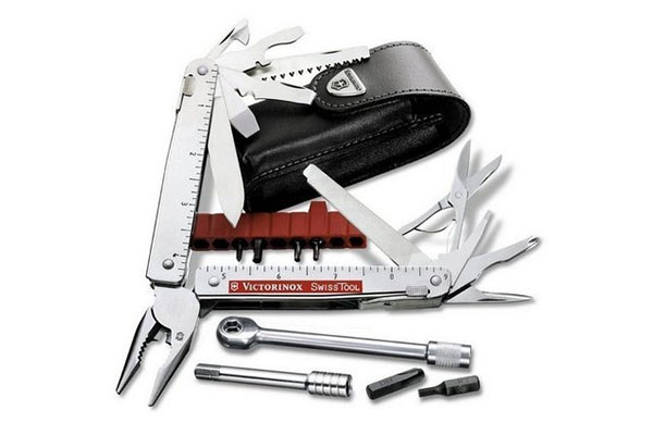 На вид, SwissTool похож на острогубцы, но в рукоятках скрывается множество других полезных инструментов. Здесь вы найдете несколько видов отверток, штопор, нож для открытия консервных банок, пилу по дереву и по металлу, различные линейки, изолирующий скребок, лезвие с волнистой заточкой, мощную фомку, инструмент для откусывания проволоки, стамеску, фиксирующие механизмы, электрические щипцы, а также индивидуальные пружины.