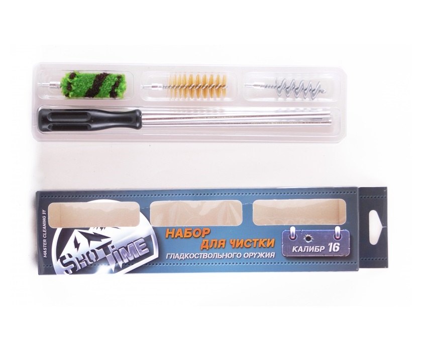 Набор для чистки ShotTime для гладкоствольного оружия 16 калибра, составной металлический шомпол (3 колена) + 3 ерша (пуховка, спираль, щетина). Набор имеет компактные размеры, что позволяет использовать его с одинаковым успехом не только в домашних условиях, но и «в поле» для решения оперативных задач по чистке либо обслуживанию оружия.