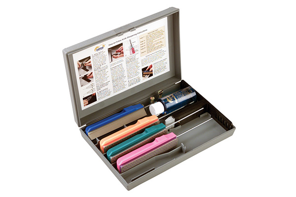 Набор для точения ножей Gatco Edgemate GT10004, содержащий 4 абразива (грубый, средний, мелкий), флакон масла, зажим для фиксации ножа, инструкцию. Набор размещается в удобном боксе, который можно возить с собой на дачу, в поход, поездку. Он же предохраняет точила от загрязнений. Точила позволяют затачивать ножи под разными углами.