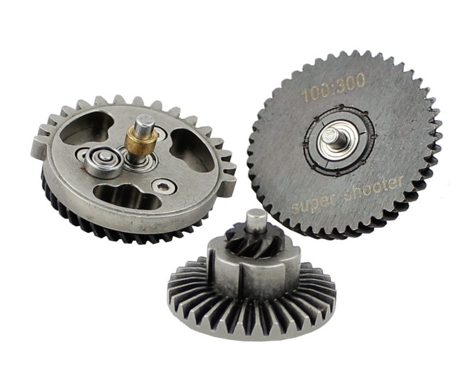 CL4015 – набор усиленных косозубых шестерней High Torque 100:300 от компании SHS / SuperShooter, Китай. Изготовлены из стали. Пониженное передаточное число позволяет возводить более мощные пружины до SP170 включительно. Рекомендуется использовать только с втулками, использование с подшипниками может привести к их разрушению. В среднюю и секторную шестерни встроен подшипник. Предназначены для полузубых и полнозубых поршней.