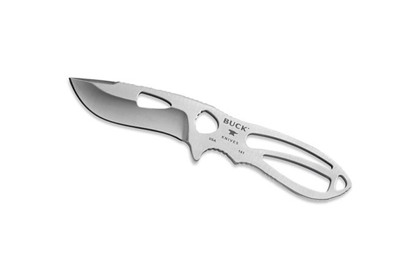 B0141SSS — это оригинальный нож, изготовленный в виде скелетированного шейника (в облегченном варианте) от фирмы Buck. Материалом для изготовления является цельный стальной брус марки 420 HC, которая содержит много углерода. Такой нож любят не только охотники и любители рыбной ловли, но и туристы. Часто такой нож является дополнительным, не редко его используют и в самообороне. Такой нож очень легкий, комфортный и может легко прятаться под одеждой. Для противодействия коррозии, нож покрывается специальным покрытием. Форма клинка — clip point. Ножичек не складывается, имеет фиксированный клиночек. Общая длина ножа равна 232 мм. Толщина клинка равна 4,6 мм, а его длина достигает 89 мм. Рукоять собрана из нержавеющей стали, она удобно ложится в руку и не соскальзывает. Цвет у клинка — серый. Лезвие ножа имеет прямую заточку. Такой нож весит всего 117 грамм, при этом твердость клинка достигает 54-56 HRC. Из достоинств ножа следует отметить: продуманность конструкции, отличное качество, хорошие ножны, доступную цену.