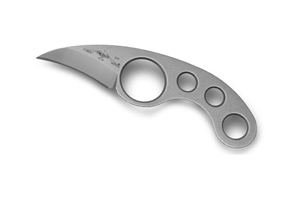 Серповидная клиночная форма сравнивается с клювом ястреба. Данный вид формы популярный у ныряльщиков, яхтсменов, садоводов, рыболов. Используя этот нож, можно осуществить удобную перерезку ветки и веревки. Chisel Grind шлиф обеспечивает плоскость в клинке с одной стороны. Из-за Plain имеется гладкий тип лезвийной кромки. Обушковая толщина – 3,2 мм.