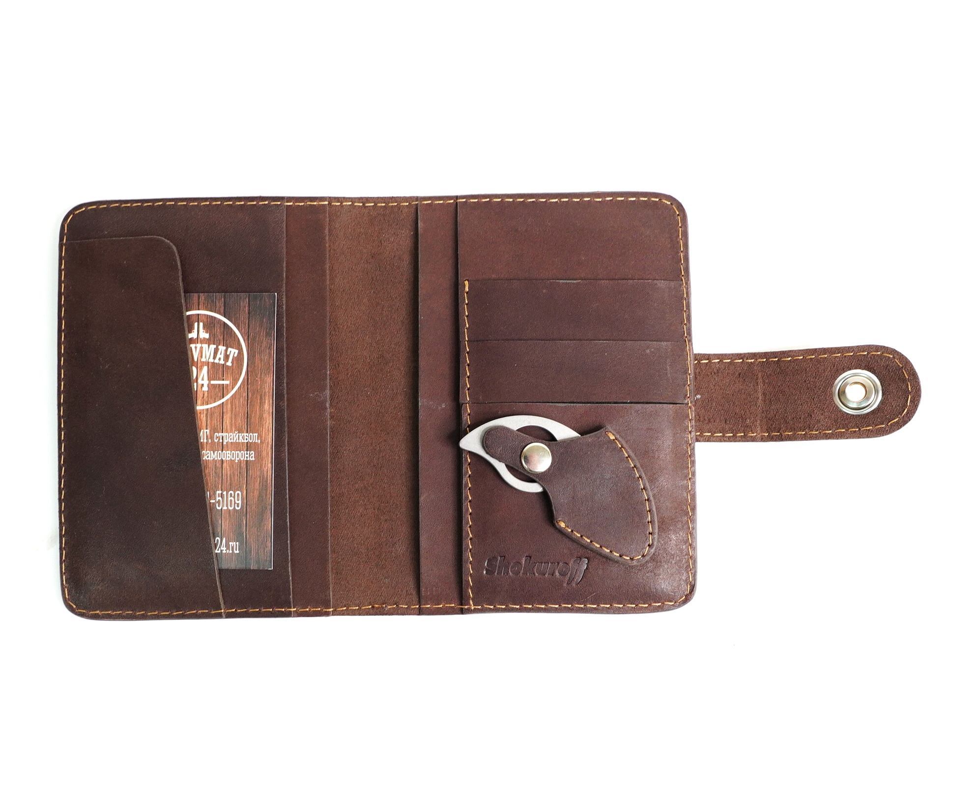 Стильный, практичный и компактный аксессуар от мастерской Шокурова в ножнах из натуральной кожи. Ручная работа, добротная кожа, качественное исполнение.