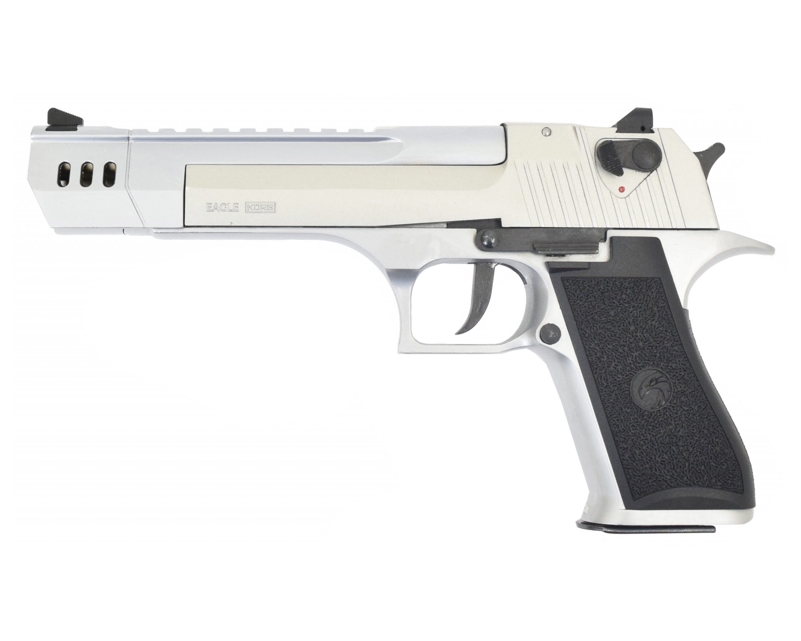 Охолощенный СХП пистолет Eagle Kurs, 10ТК, хром – это новая разработка российского предприятия Курс-С, модель на основе Deseart Eagle, популярного американского пистолета под патрон .50AE. Изделие повторяет механизм работы своего знаменитого прототипа, и предназначена для стрельбы светошумовыми патронами 10ТК. Охолощение пистолета выполнено в заводских условиях, поэтому никакие изменения в его конструкцию не способны обеспечить пистолету возможность вести боевой огонь.