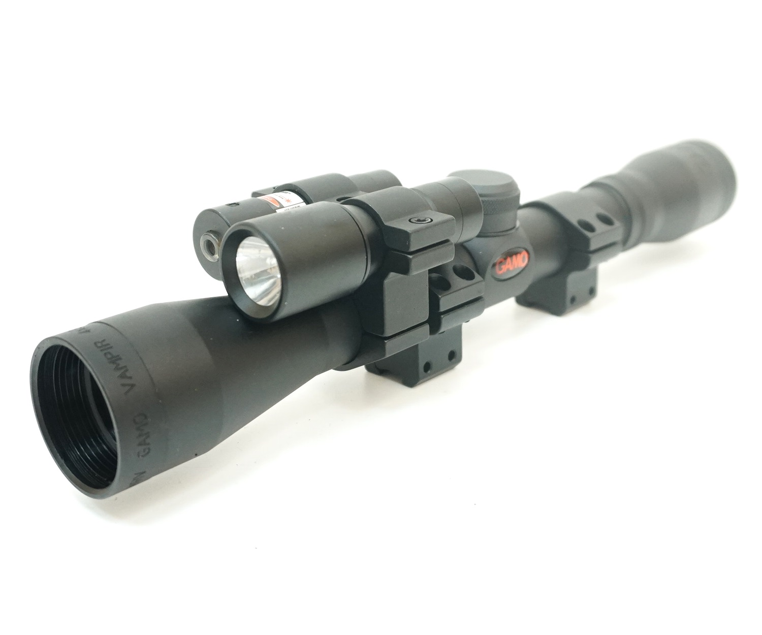 Классический опический прицел испанского производства Gamo 4×32 WR Vampir имеет богатую комплектацию и высокое качество изготовления. Кроме самого оптического прицела, дополнительно установлен лазерный целеуказатель и тактический фонарь. Фонарь позволяет в вечернее время быстро подсветить цель, а ЛЦУ дает возможность вести более уверенную стрельбу на разных дистанциях. Также прицел комплектуется кронштейном моноблоком на планку 11 мм («ласточкин хвост»).