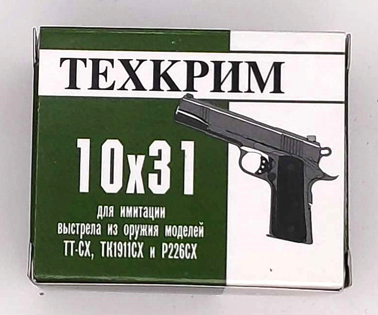Патроны светозвуковые (шумовые) калибра 10×31 предназначены для имитации выстрела из списанного (охолощенного) оружия ТТ-СХ, ТТ 33-О, Smersh-TT. По 20 штук в упаковке. Патрон травмобезопасен, стрельба с помощью них громкая и эффектная.