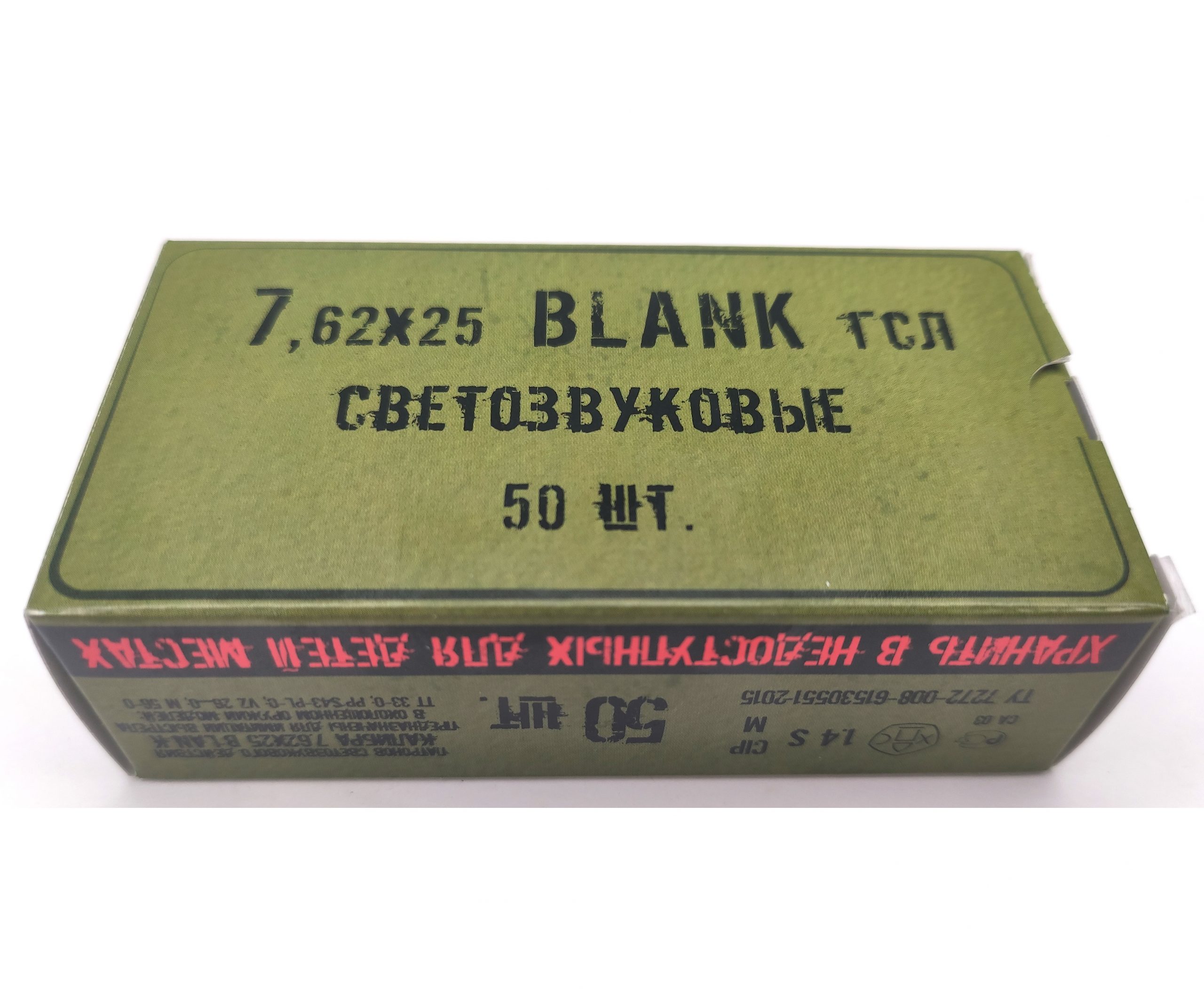 Патроны светозвуковые (шумовые) калибра 7,62×25 предназначены для имитации выстрела из списанного (охолощенного) оружия ТТ 33-О, PPs43 PL-O, VZ 26-O. По 50 штук в упаковке. Патрон травмобезопасен, стрельба с помощью них громкая и эффектная.