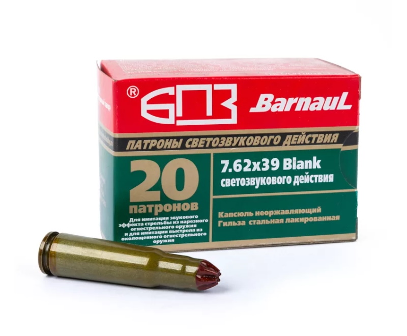 Патроны светозвуковые (шумовые) калибра 7,62×39 предназначены для имитации выстрела из списанного (охолощенного) оружия ВПО-925, ВПО-926, ВПО-927, АКМ-СХ, АК-103, АКМС-СХ, РПДХ-СХ. По 20 штук в упаковке. Патрон травмобезопасен, стрельба с помощью них громкая и эффектная.