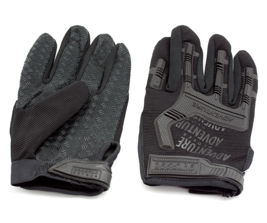 Перчатки тактические Adventure полноразмерные черного цвета. Особенности: прорезиненный кастет, регулируемые манжеты, антивибрационные демпферы, термостойкий материал, закрытые пальцы рук.