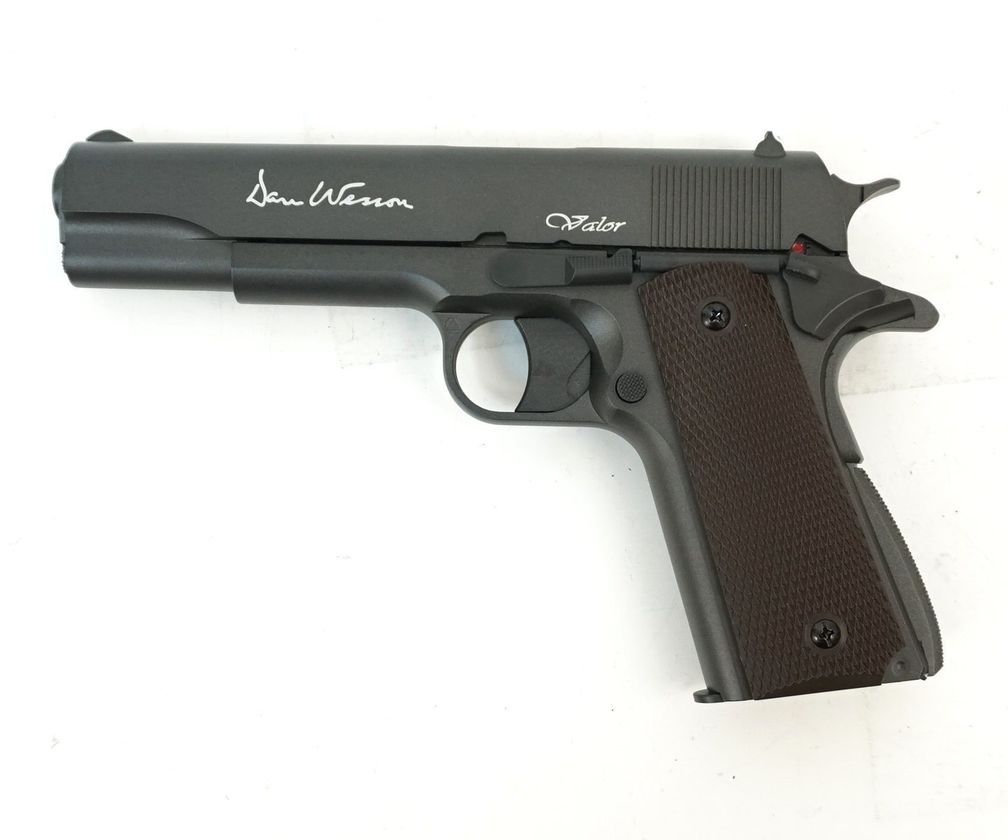 Пневматический пистолет ASG Dan Wesson Valor 1911 – это газобаллонная реплика от ASG, созданная на базе непревзойденного Кольта М 1911 года. Как и каждое изделие этого бренда, пистолет имеет собственный серийный номер. Источником энергии здесь выступает стандартный баллончик с углекислотой на 12 грамм, который располагается в магазине, устанавливаемом в рукоятном отсеке. Пневматическими пулями снаряжается полноразмерный роторный магазин, в его двойной поворотный барабан входит 12 зарядов.