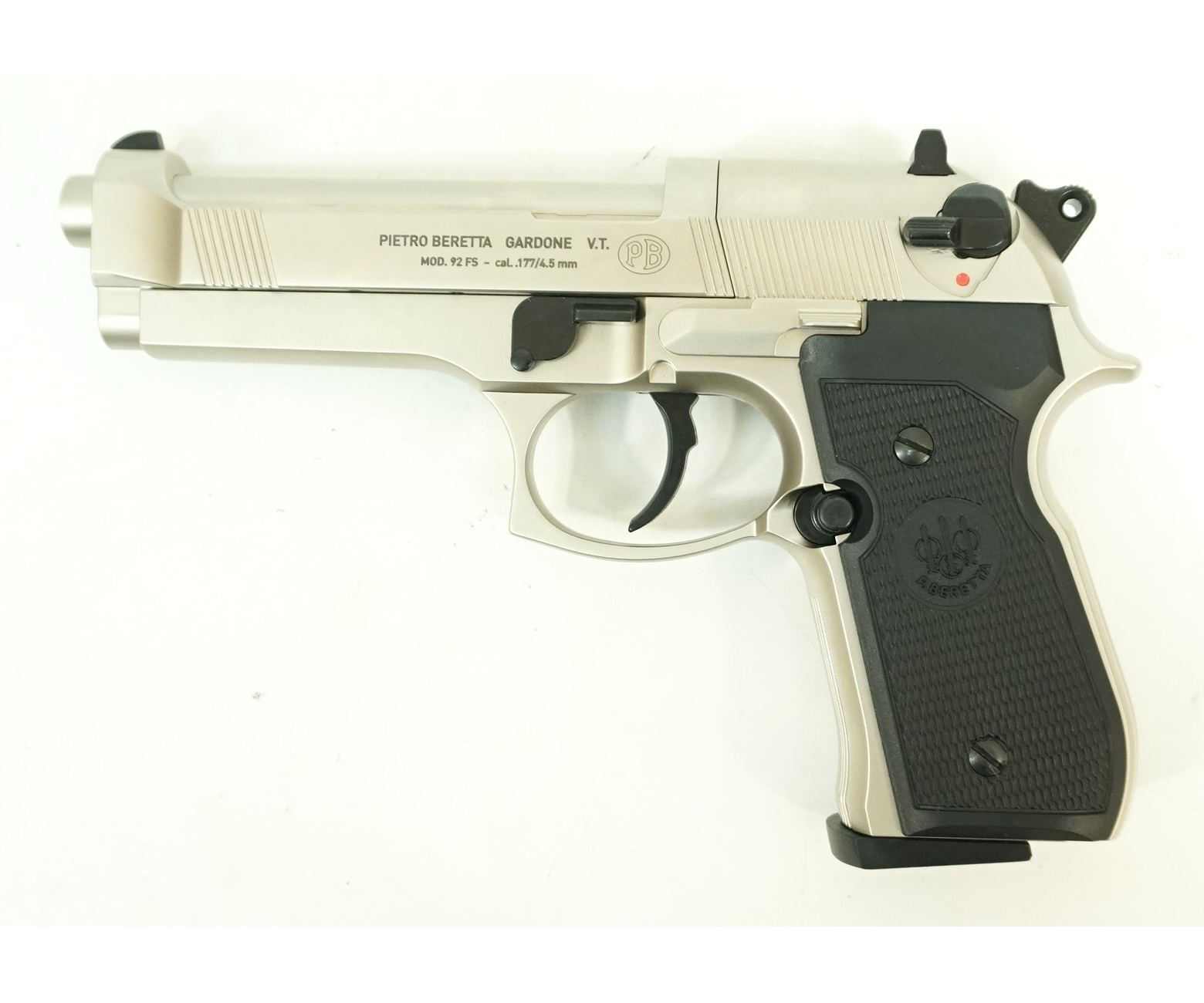 Модель Umarex Beretta M92 FS (никель) сделана из металла, она имеет матовое никелированное покрытие, потому выглядит очень красиво и солидно. Накладки на рукоятку пластиковые чёрные. Точность стрельбы повышают нарезной ствол высокого качества, хорошая настройка прицела, значительная масса оружия (1,26 кг) и лёгкий спуск в случае стрельбы с предварительного взвода. Разумеется, данная пневматическая модель пистолета не только по массе схожа с легендарной Береттой, а и по внешности совершенно копирует огнестрельный прототип.
