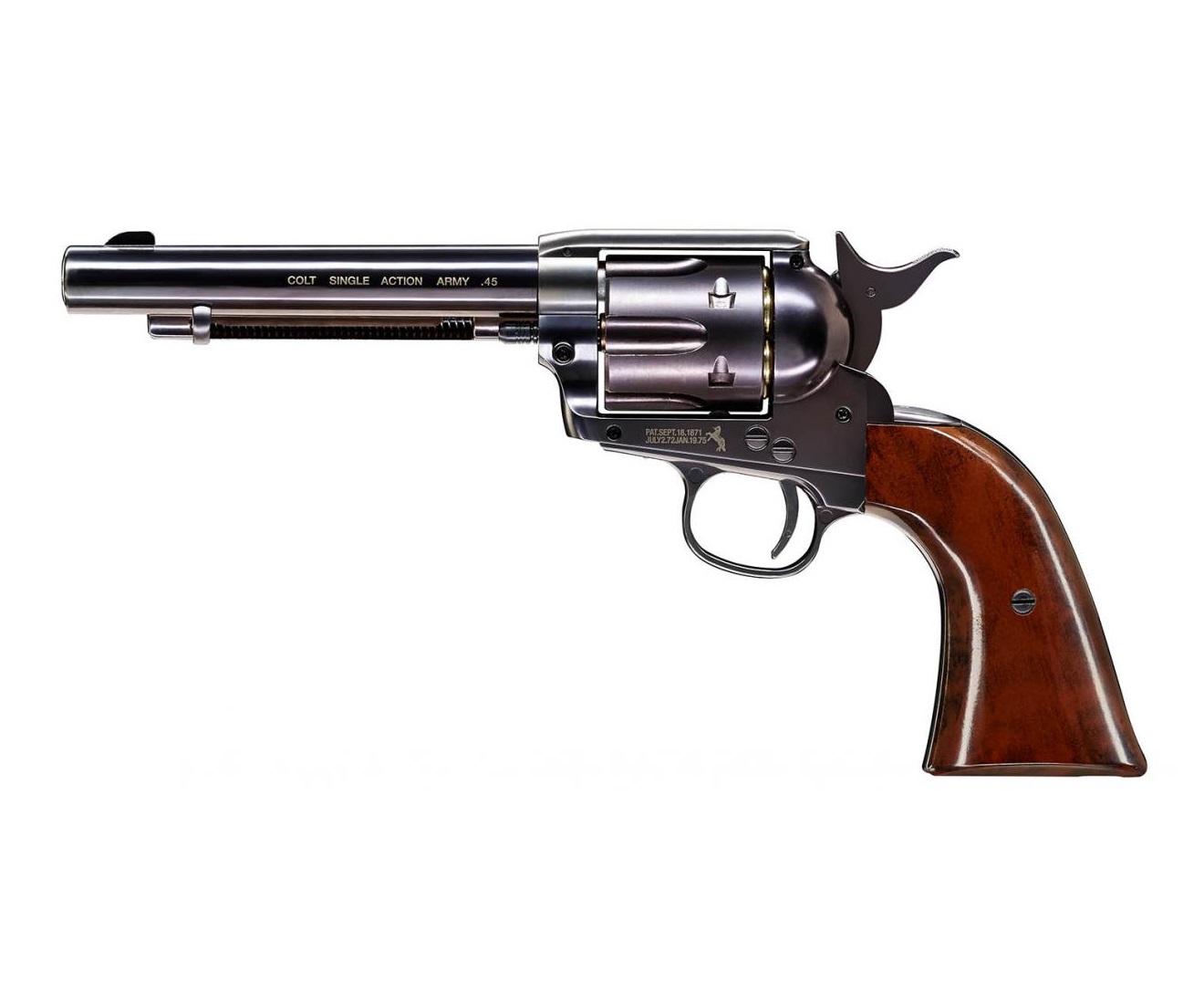 Пулевой Umarex Colt Single Action Army (SAA) 45 рассчитан на стрельбу боеприпасами для пневматического оружия 4,5 калибра. Газовый баллончик легко устанавливается в отсек рукоятки револьвера. Барабан у модели шестизарядный, УСМ здесь одиночного действия, т.е. требуется предвзвод курка. На корпусе установлен неавтоматический предохранитель с двумя положениями. Пуля при выстреле получает начальную скорость в 115 м/с. Поскольку модель имеет дульную энергию не более 3 Дж, такое оружие продается без лицензии и разрешений.