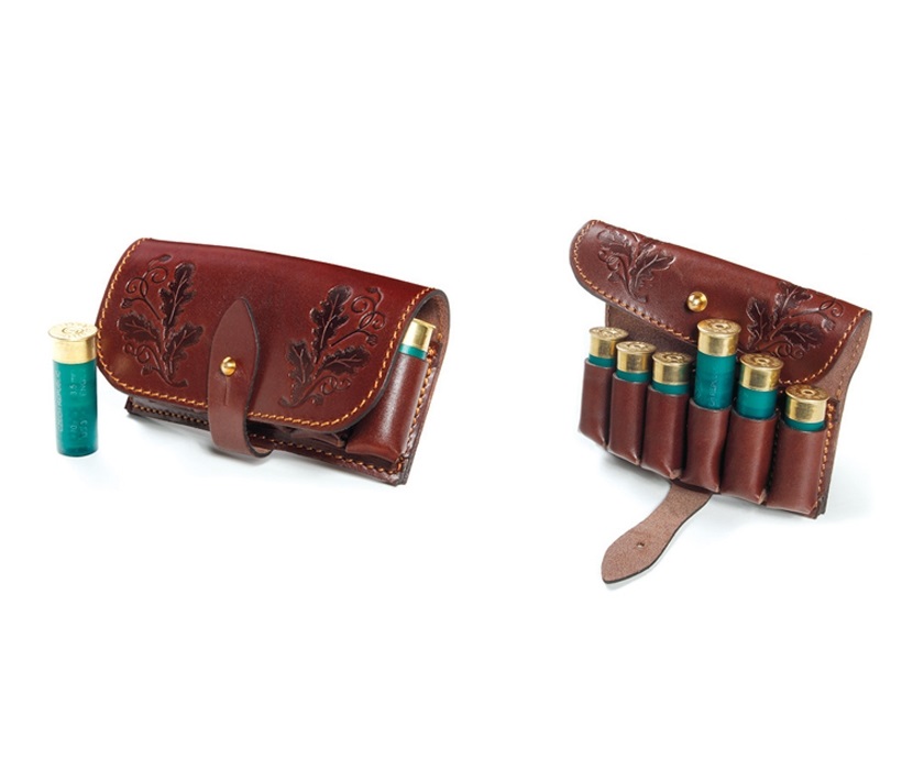 Однорядная патронная сумка закрытого типа из натуральной кожи с тесненным рисунком дубовые листья для хранения и транспортировки шести патронов 12, 16, 20 калибра. Крепится с помощью шлеек на поясной ремень шириной до 40 мм. Кобурная застежка подсумка. Фиксация патронов в сумке за счет карманов из натуральной кожи.