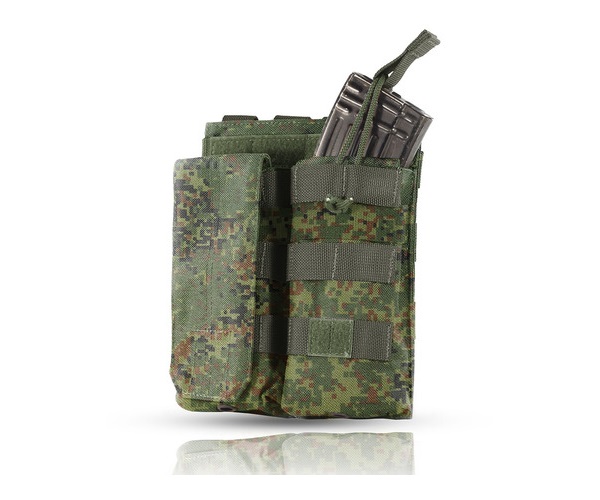 Подсумок оснащен вариативной системой закрывания: на клапан с липучкой, либо с помощью резинки. Так же оснащен утягивающей вокруг резинкой, что надежно защищает магазин от утери. Заправив клапан внутрь подсумка, допустимо его использование как открытого. Возможно размещение на обычном ремне. Доступен в различных цветах, данный вариант в цвете камуфляж.