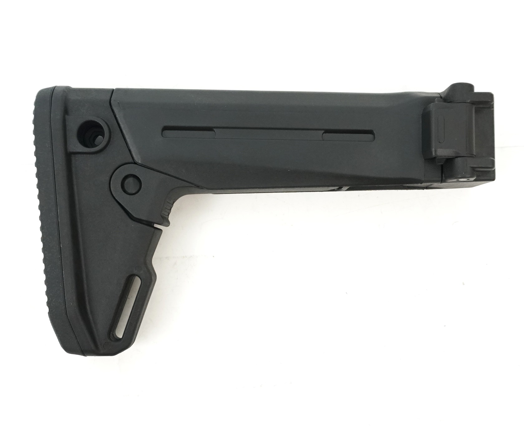 Приклад складывается вправо, есть возможность регулировки длины (5 позиций), присутствует крепление для быстросъемной (QD) антабки.