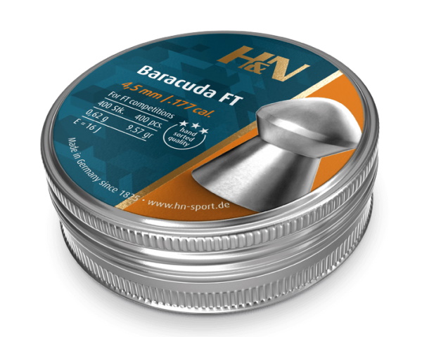 Пули H&N Baracuda FT — высокоточная пуля для дальних дистанций. Эта пуля оптимально подходит для соревнований Field Target и Hunter Field Target. Самые лучшие результаты точности эта пуля показывает в пневматических винтовках с дульной энергией 16 Дж. После 5 выстрелов на 50 м кучность не превышает диаметр (C-T-C) 12 мм и после 20 выстрелов — не превышает диаметр 20 мм. Таким образом Baracuda FT устанавливает новые стандарты точности на дальних дистанциях. В упаковке 400 штук.