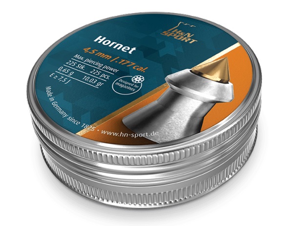 Пули H&N Hornet — средние nо тяжести, точные охотничьи пули для средних дистанций. Высокая пробиваемость и улучшенный аэродинамический дизайн благодаря металлическому острию. Превосходная экспансивность и высокая приникающая способность. Поверхность гладкая с латунным остриём. В упаковке 225 штук.