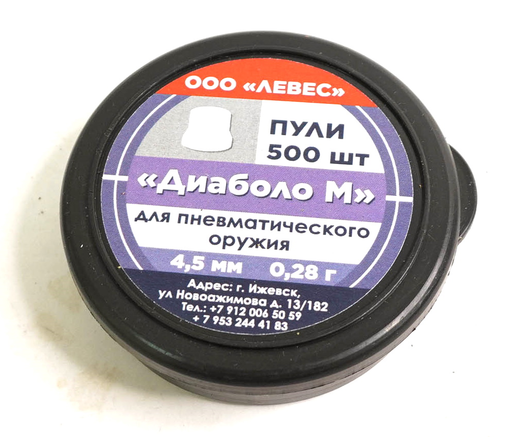 Пули Левес Диаболо М калибра 4,5 мм — колпачковые легкие свинцовые пули. Отличаются большим процентом кучности и эффективностью в сохранении энергии на дальних дистанциях. Благодаря точной развесовке пули, обеспечивается минимальное трение пули о стенки ствола оружия и высокая устойчивость боеприпаса в полёте. В упаковке 500 штук, средний вес 0,28 грамм.