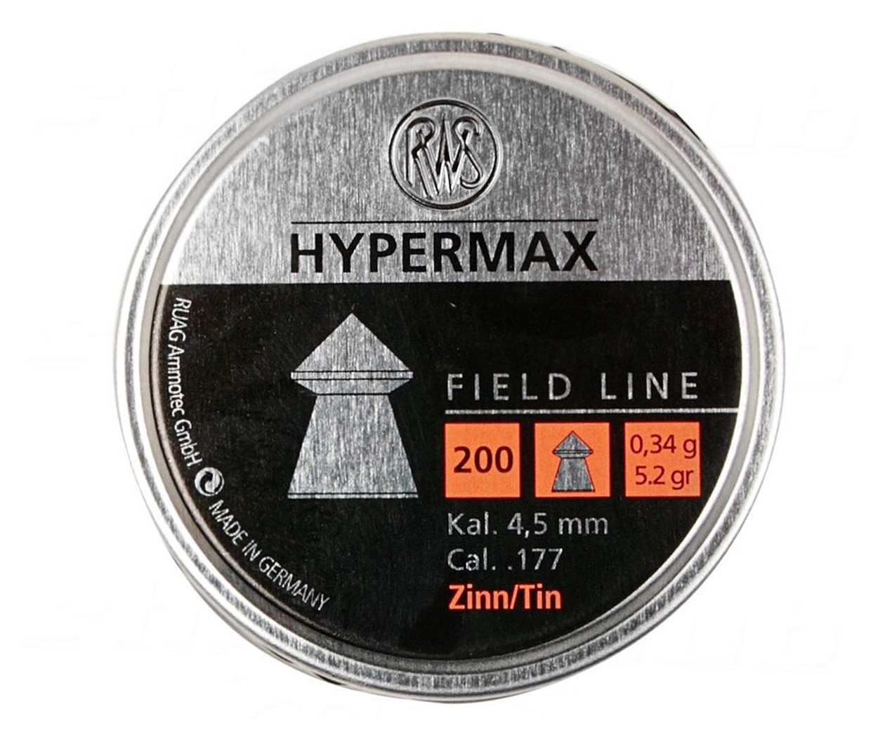 Пули RWS Hypermax калибра 4,5 мм — это высокоточные облегченные пули с острой головкой. Состоят из высокотехнологичного легированного олова. Конусовидная головная часть обеспечивает высокую пробивную способность пули. Данная пуля идеально подходит для полевой стрельбы (Field Target), также возможно применение на охоте. Пули весят всего лишь 0,36 грамм, в упаковке 200 штук.