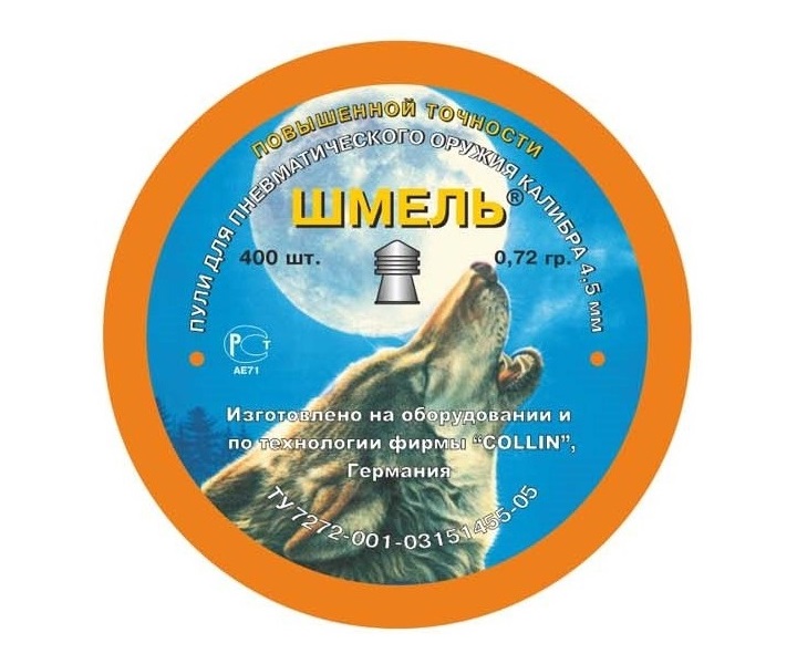 Пули Шмель повыш. точности калибра 4,5 мм — штампованные свинцовые пули с конической головной частью. За счёт появления двух колец завихрения, потеря давления в канале минимальна, вследствие чего увеличивается начальная скорость. Ввиду превосходных баллистических характеристик, обеспечивает высокую стабильность в полете. В упаковке 400 штук, средний вес 0,72 грамм.